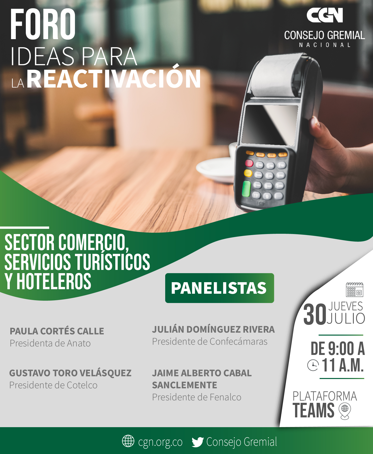 Este 30 de julio, también participarán en el foro: Paula Cortés; Presidente de Anato, Gustavo Toro; Presidente de Cotelco y Jaime Alberto Cabal, Presidente de Fenalco.