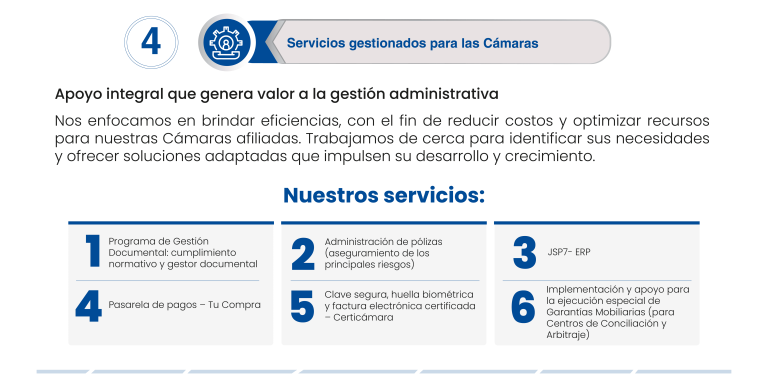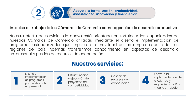 Apoyamos a las Cámaras de Comercio en su rol de agencias de desarrollo productivo en las regiones donde adelantan su gestión, a través de cinco líneas de servicio.