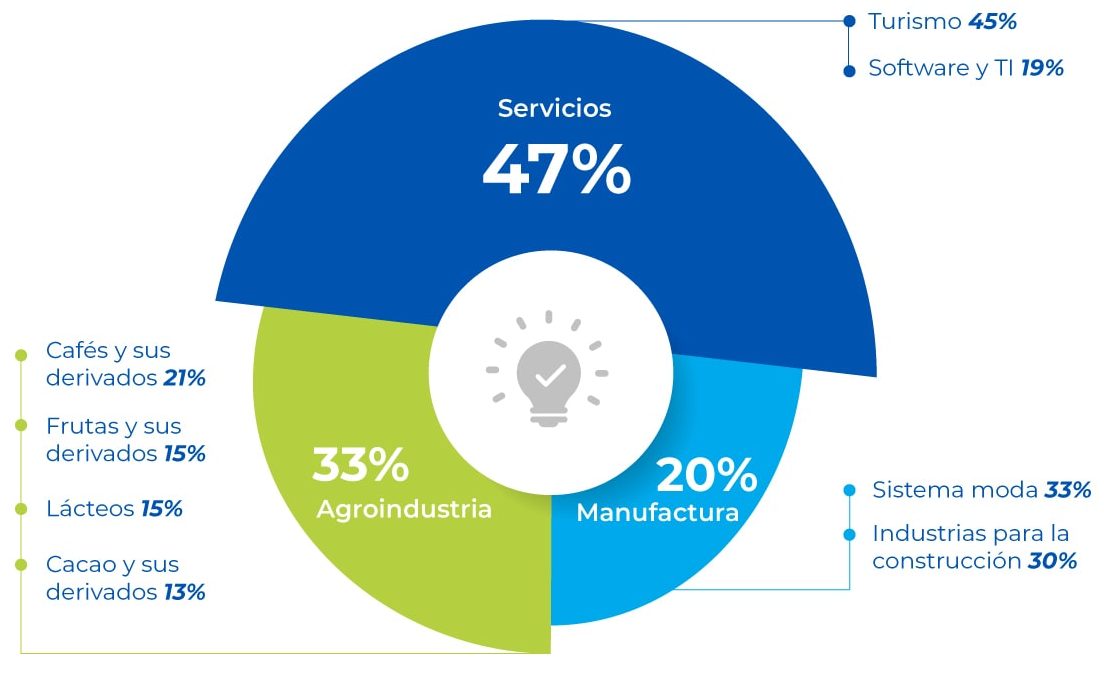 La Red Clúster Colombia tiene registradas 161 Iniciativas Clúster que promueven el desarrollo productivo y sostenible en las regiones. Estas iniciativas tienen mayor representatividad en los siguientes sectores: