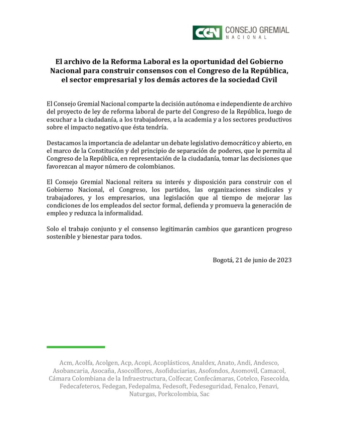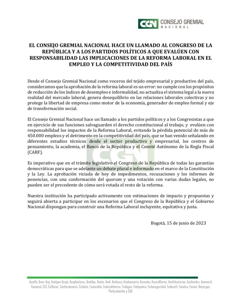 Desde el Consejo Gremial Nacional como voceros del tejido empresarial y productivo del país, consideramos que la aprobación de la reforma laboral es un error: no cumple con los propósitos de reducción de los índices de desempleo e informalidad, no actualiza el sistema legal a la nueva realidad del mercado laboral, genera desequilibrio en las relaciones laborales colectivas y no protege la libertad de empresa como motor de la economía, generador de empleo formal y eje de transformación social.