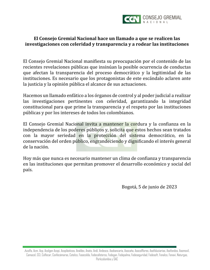 El Consejo Gremial Nacional manifiesta su preocupación por el contenido de las recientes revelaciones públicas que insinúan la posible ocurrencia de conductas que afectan la transparencia del proceso democrático y la legitimidad de las instituciones.